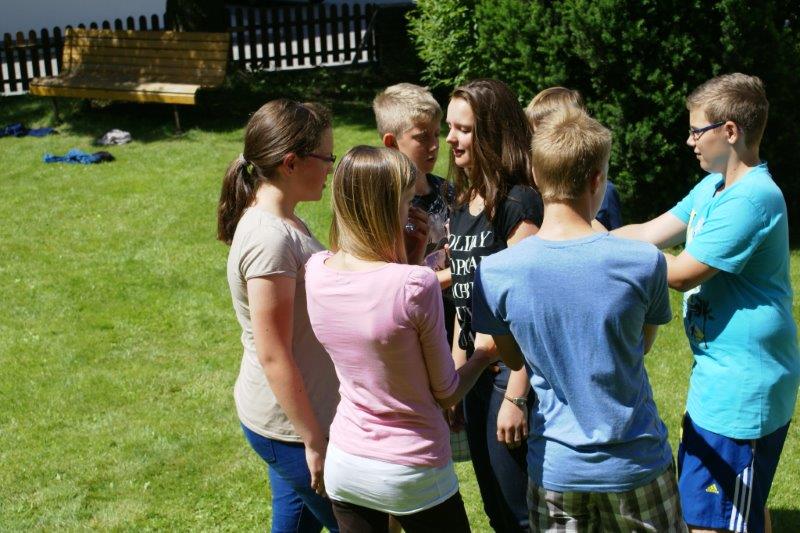 Nach dem anstrengenden Tag in den Bergen, sind wir heute am Dienstag, bei herrlichem Wetter, zu Hause geblieben. Wir haben die Geschichte von Petrus, der im Vertrauen auf Jesus über das Wasser gehen konnte, kennengelernt. In unseren Kleingruppen haben wir ebenso versucht einander zu vertrauen. Mit verbunden Augen haben wir uns durch das Haus und über den Hof geführt. Die ganz Mutigen haben sich im Klettergurt in die Ahr abseilen lassen. Alle haben mit diesen Übungen gute Erfahrungen gemacht und sind glücklich sich auf das Experiment eingelassen zu haben. Flöthe, Ralf Ohainski, 03.07.2013