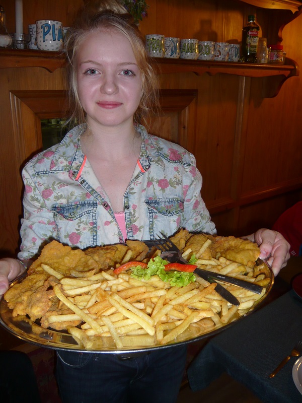 Zum Mittag gab es knusprige Pommes und Schnitzel, "soviel du brauchst"! Und zum Nachtisch Biskuitrollen. Der Tischdienst hatte viel zu tun, die Platten waren heiß begehrt. Ja, Frau Hofer verwöhnt uns so, dass wir immer wieder staunen!
