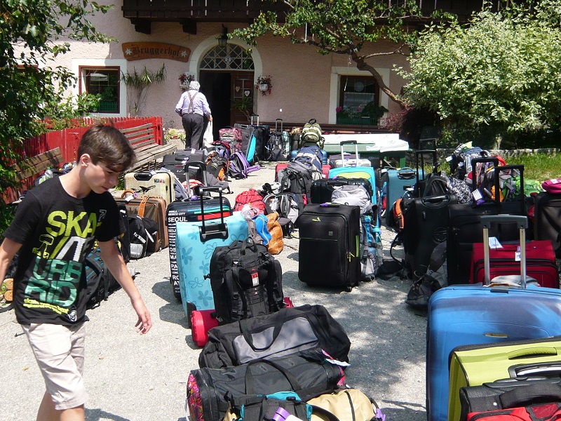 Mit Sack und Pack bei strahlendem Sonnenschein, müde, aber guter Dinge haben wir den Bruggerhof in Beschlag genommen. Die von den Eltern gepackten Überseekoffer sind fast ausgepackt. Familie Hofer hat uns mit Spaghetti zu Mittag und Kaiserschmarrn zum Abendessen fürstlich empfangen.