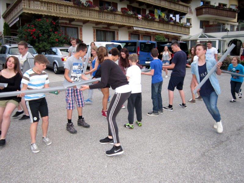 Am heutigen Montag sind wir bei bewölktem Himmel und kühlen Temperaturen zur Bizathütte gewandert. Der Aufstieg war bei diesem Wetter leichter als in vorangegangen Jahren. Aber als wir noch unterwegs waren, klarte es auf und die Sonne kam raus. An der Bizathütte war es dann doch so sonnig und warm, so dass viele die Mittagspause nicht nur zum Essen und Ausruhen, sondern auch für eine zünftige Wasserschlacht nutzten. Am Abend haben wir dann noch das "Dachrinnenspiel" gespielt, dabei hat diejenige Mannschaft gewonnen, die einen Tischtennisball mittels ihrer Dachrinnen am schnellsten ins Ziel bringt. Derjenige, der gerade den Ball hat, darf aber nicht laufen oder gehen. Und wenn der Ball auf den Boden fällt, muss die Manschaft von vorne beginnen. Das kann ganz schön anstrengend werden!