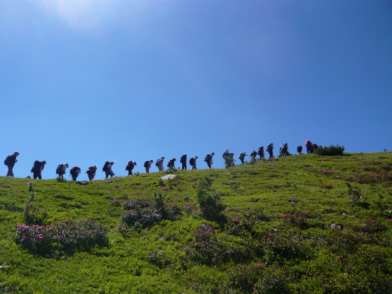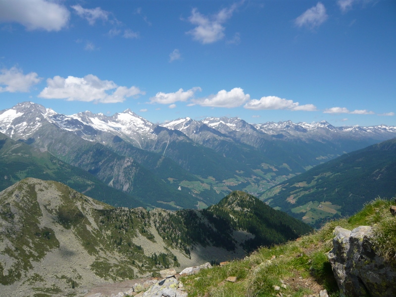 Nach dem Mittagsgebet ging es weiter auf den höchsten Gipfel, den Speikboden. Was für ein herrlicher Tag: die wunderbare Aussicht auf die Berge in absoluter Klarheit, Sonne pur und nicht zu heiß. Beim steinigen Abstieg zum Kleinen Nock, dem 3. Gipfel, genossen wir den herrlichen Ausblick auf die Bergwelt des Ahrntals und unten auf unsern Bruggerhof.
