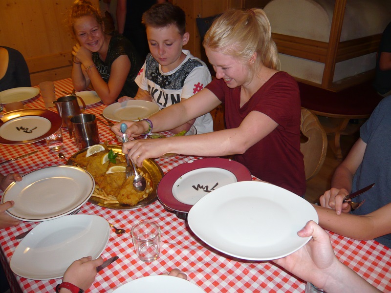 Zur Freude aller gab es ein Festessen: Spaghetti als Vorspeise, reichlich Pommes und Schnitzel zum Sonntag, warmer Kuchen zum Nachtisch! Familie Hofer verwöhnt uns wirklich!