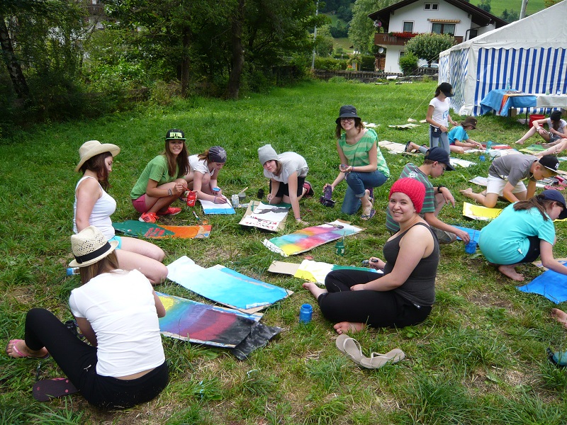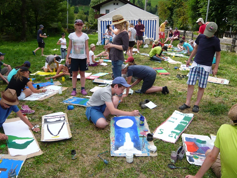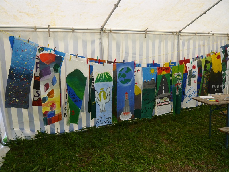 Am Nachmittag bemalten wir unsere Jurten-Platztücher auf unserer Wiese. Schön und farbenfroh sind sie geworden.